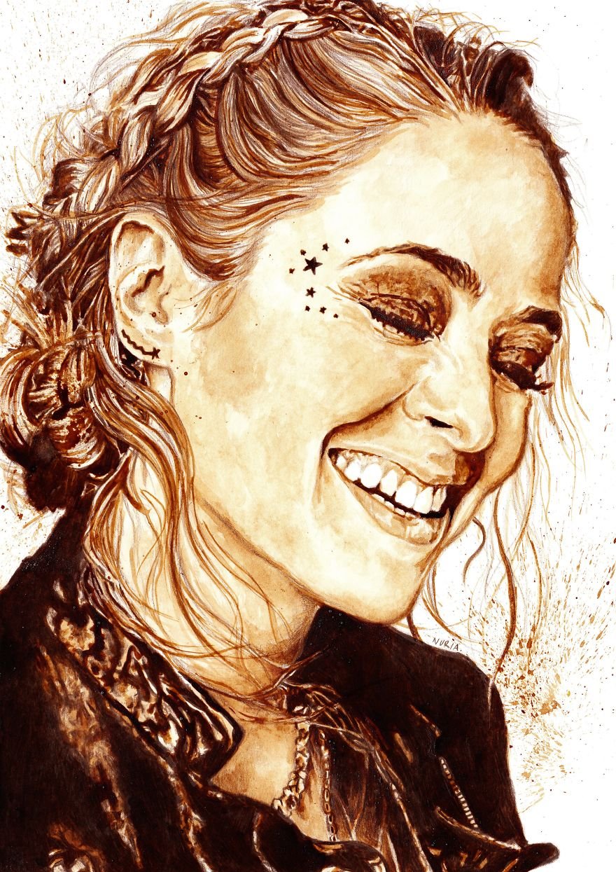 A következő képek, alkotások kávéval és barna ceruzával készültek. Nuria szerint a kávé hasonló a vízfestékhez, de mivel csak egyfajta tónusa van, jobb azt kiegészíteni ceruzával, hiszen ez segít az apró részletek kidolgozásában, a finom vonalak ábrázolásában. A kávé már önmagában is elég egyedi és egyedülálló művészeti technika, Nuria szerint pedig azért is igazán különleges, mert megannyi lehetőséget ad. Amellett, hogy a színskálája elég széles, a kávé a minőség mellett egy nagyon kellemes meleg hatást is ad az alkotásoknak.